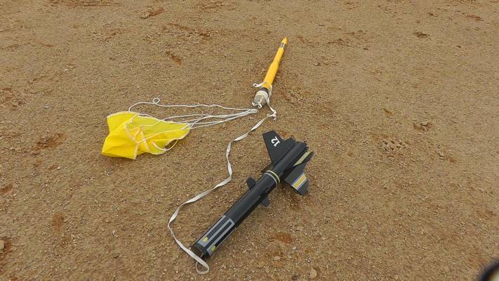 It reached a speed of 168 mph, and coasted for 5.2 seconds before reaching an apogee of 742 feet. Ejection was late at 7.9 seconds, allowing the model to descend for 2.7 seconds to an altitude one hundred feet lower (641 feet). During this coast time it traveled very far upwind. The parachute ejected and it descended at 19 mph - a bit fast but safe enough (normally).
