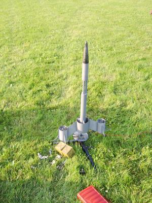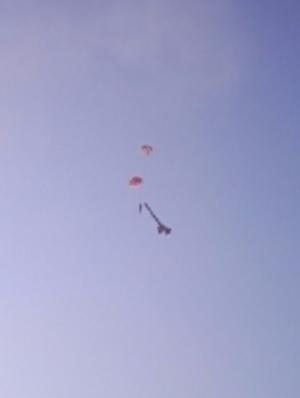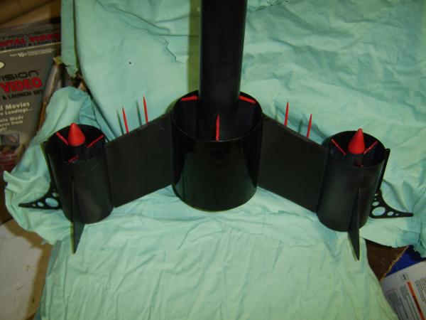 I flew Black Death unpainted (primer only) on a D12-3 motor and a spacer (since it is designed to hold an 'E' motor. I considered trying to fly on an 'E,' but the simulations say that an E-9 would a shade too slow off the pad without motors in the outside pods. The simulation (Alticalc) suggested that I could expect an altitude of over 250 ft. and I was not disappointed. With the odd bend in the main BT, I fully expected that Black Death might just arc over and die as the pilot's Widow Maker but despite its odd bend, Black Death flew perfectly straight and got every bit of it's predicted altitude. Both parachutes deployed perfectly but the motor still managed to get burped after separation. With the motor separating from the rocket, I feel very lucky that I got a good deployment and didn't get a ballistic recovery.