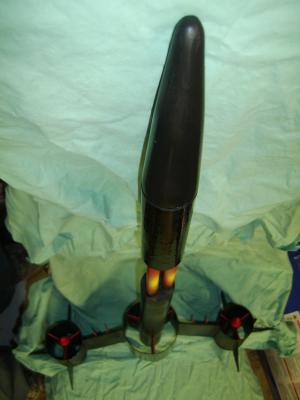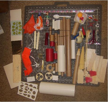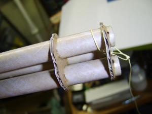 In order to lengthen the main BT, I made four CR's that held three 13mm BT's. One BT was glued on each end and a second 1.5 inches in from the end. This allowed me to lengthen the BT by an additional 4-1/4" as well as adding an interesting look. I painted these tubes so that they look to be glowing and refer to them as the plasma conduits. At the top of this assembly I drilled a hole in the center of the top CR and passed a length of Kevlar through it, looped it around one tube and tied it off. This is one place I may have cheated. I forgot that I had Kevlar in my Box-o-parts and used some of mine, only finding the boxed Kevlar later after it was impossible to replace in the assembly. The second place I stretched the rules was when I checked the assembled rocket for being straight. I found that the plasma conduit assembly was crooked and as a result, the nose of the rocket was not completely in line with the back. Trying to fix it, I removed the 5" section of BT at the top and replaced it with a new section of my own, exactly the same length as the original. It didn't work. The final assembly had nearly the same bend to it as the original despite leaving it overnight with three hammers on top to keep it pressed against a flat surface while the new glue dried.