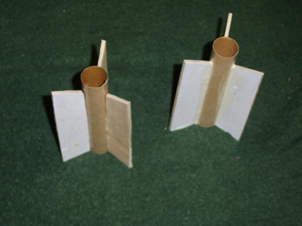The nose cone for the BT-60 was made of some kind of foam and after making cardboard cutouts (top view and side view) to find the CP, I needed a lot of nose weight to get the CG where it needed to be. The assembled rocket (without paint) weighed about 5 ounces and to get the CG where I felt it was safe I drilled a half inch hole 4" deep in the NC and dropped in a piece of steel rod and a large lead tire weight so that the NC was also 5 oz. These were then epoxied in and the eyelet was screwed into both the epoxy and the lead weight. For the 18mm engine mounts I did not have matching NC's but did have two smallish ones that were similar so I whittled a balsa cone down to nearly match a plastic one that resembled a space shuttle SRB cone.