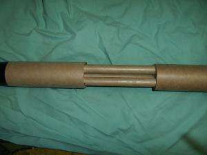Since there was not a lot of fin material in my box and since there were a lot of large body tubes, I immediately thought of building a tube fin or ring fin rocket. At the same time, I had plenty of smaller BT sizes and a few smaller nose cones so I wondered about using smaller BT's in the center of the large BT's and making them appear to look similar to a jet aircraft engine. The center ring fin tube is 3.6 in. and 4 in long and each of the outboard ring fins are 2.6 in diameter although one is a BT and the other is a coupler for the same size tube so it is a little smaller. Both are 4 in. in length. The main tube is BT-60 but there wasn't enough to make the design I wanted stable so I cut a 5 in length separate from the main section (13-3/4").