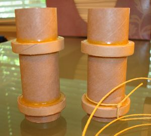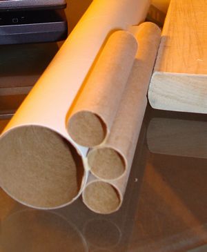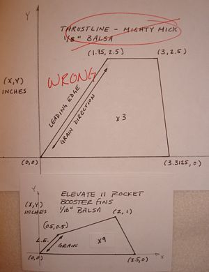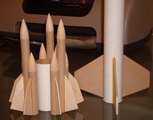 paper typeBefore I describe construction of the CBI, a short discussion of the design effort is in order. As stated earlier, this rocket was originally intended as an entry in the EMRR Elevate Eleven contest. One of the earlier "suggestions" posted for that contest was to design a rocket with eleven stages (yeah right). It got me thinking though and I wondered if I could design a staged rocket that used 11 motors...or how about a booster with 10 motors lifting a sustainer with the 11th motor! I spent many hours playing around in RockSim and went through quite a few design iterations before arriving at the basic CBI concept. That concept went through several changes before I settled on the final design. One thing that drove the design that in hindsight seems kind of silly is that I had a set of fins that I wanted to use for the sustainer. These fins had been cut out for a clone that I was working on, and after I cut them out I realized that they were not the correct shape. They were too nice to just throw away, but I was getting annoyed looking at them and was determined to put them to use. To make a long story short, the design would have been better off with smaller fins on the sustainer and larger fins on the booster, but I had set that design point and did not allow myself to stray... Lesson learned.