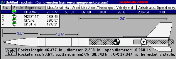 CoStar's motor mount, like the one in G-whiz, is a LOC 1.14 made from a LOC 29-in-54 motor mount adapter kit. The mount is long enough for 29/240 but I don't have one and haven't tried it. The CoStar has flown with 29/180 reloads. Unlike the RockSim drawing below, the centering rings are placed at each end of the fin tabs, 4" apart. The aft one is about 1/2" from the end of the body tube. The centering rings supplied with the kit fit inside the supplied coupler, and I didn't want to cut fin slots through a full-length coupler, so I epoxied each centering ring into one end of a 1/2" ring of the coupler and worked from there. The remainder of the supplied coupler, with a bulkhead fitted in it, connects the booster to the payload.