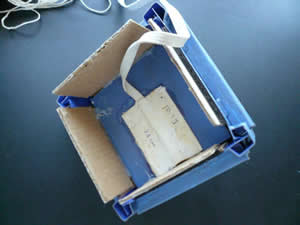 The first thing I needed was some plans for a TARDIS. I found just what I needed at www.ironcowprod.com. Just print out one copy of the front, three copies of the sides, and one copy of the supports. Then I sprayed the back sides with 3M Super 77 and laminated them onto some posterboard. (If you havent heard of Super 77 get some! It is a spray on contact cement that is ideal for rolling your own body tubes, rolling your own nose cones, gluing on your own printed decals, laminating TARDIS plans to posterboard, etc.) Then I cut them out and started to assemble according to the instructions. Once I had the sides and base dry fitted, I realized that one layer of flat posterboard is far too wimpy to withstand the forces of flight. Have no fear! I found some 1/8" corrugated cardboard in my This might be handy for building a rocket bin. This could by laminated to the backside to provide all of the strength I needed. But first, I had to cut the sides in half at the top of the door to create the separation plane for the nosecone. Then I cut my corrugated cardboard to fit, sprayed it with Super 77 and laminated it into the inside of the sides. Since I already had all of the slots cut, I cut the cardboard to fit inside of them also making allowance for the thickness of the cardboard so that the whole thing would still assemble nicely.