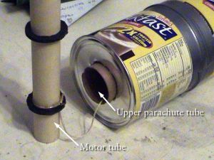 the motor tube is glued in place in the parachute tube with foamcore centering rings. 300lb Kevlar®