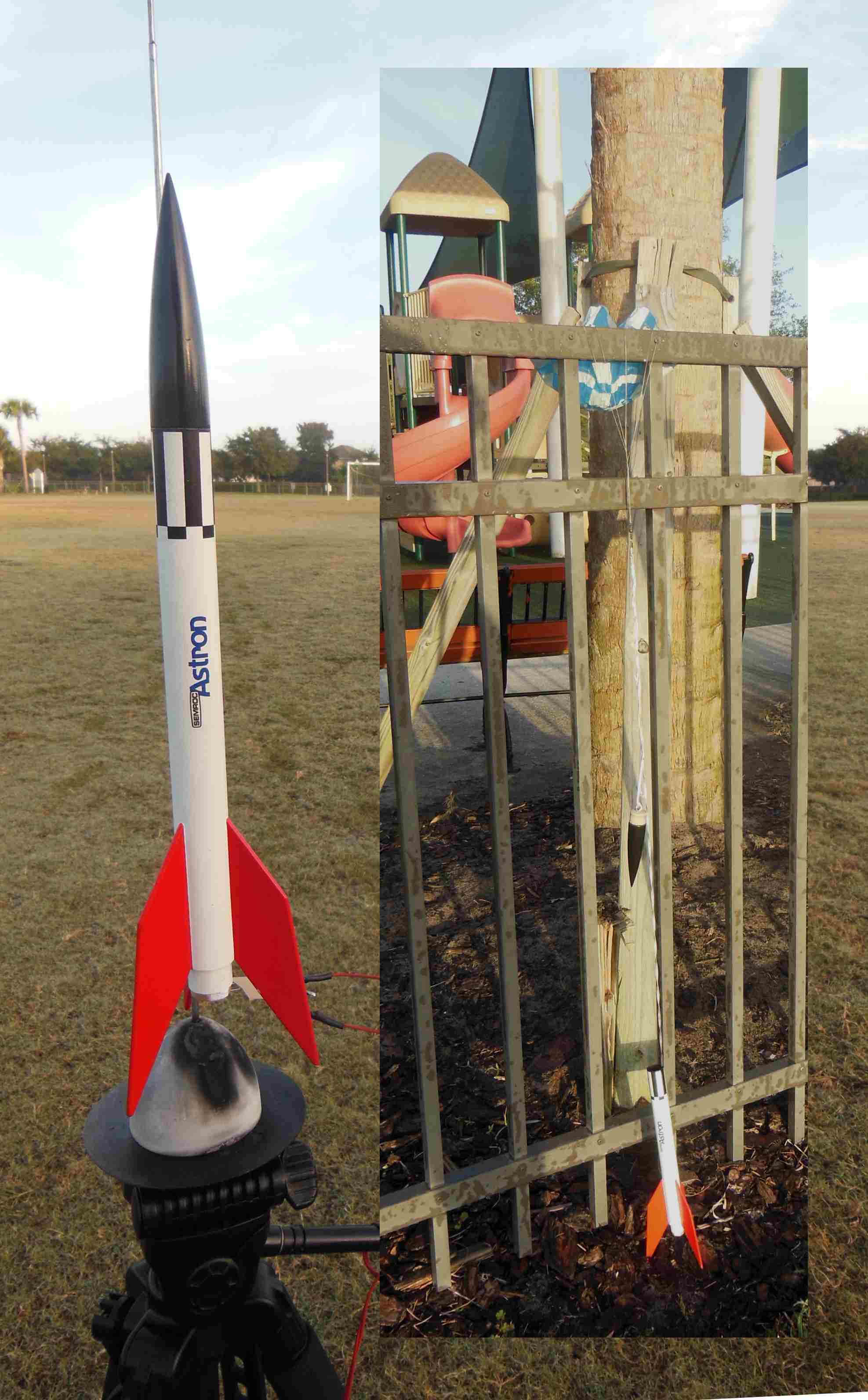 At ejection it drifted towards the playground. The parachute draped over the fence with the fins just touching the ground.