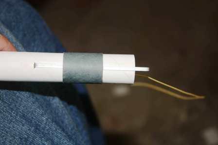 The first step in working on the engine pod was to take the motor spacer and mark off 1/4". The thrust ring was then located and the Kevlar® was tied around it. A ring of white glue was swabbed around the interior of the motor tube, using the motor spacer to mark the swab at the right depth. The spacer was then used to push the thrust ring into place, up to the mark which had been made, and withdrawn. The motor tube was then marked for the placement of the engine hook and a slit was made in the body tube to receive it. The hook was placed and a cardboard sleeve was slipped into place to hold it in place.
