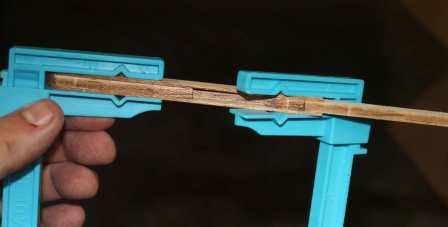 The two wing halves were then joined together in a similar manner. One side was taped down flat and the other was glued into place using the shorter of the jigs positioned under the outer joint of the untaped wing. After another day to dry, the jig was removed and things were still looking encouraging.