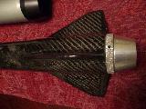 Senza Confini is a 54mm maximum performance rocket designed around the 54/2800 case from Aerotech, for the K250W. It is only 31 inches in length. It features a SUPERSHORT design, Tower-launched design, G12 Fillament wound nose cone, a T1000G Fillament wound Carbon fiber airframe, Dragon plate quasi Isotropic Carbon fiber fins, a custom designed and milled 6061-T6 tailcone, Dual deploy, and an automotive paint job.