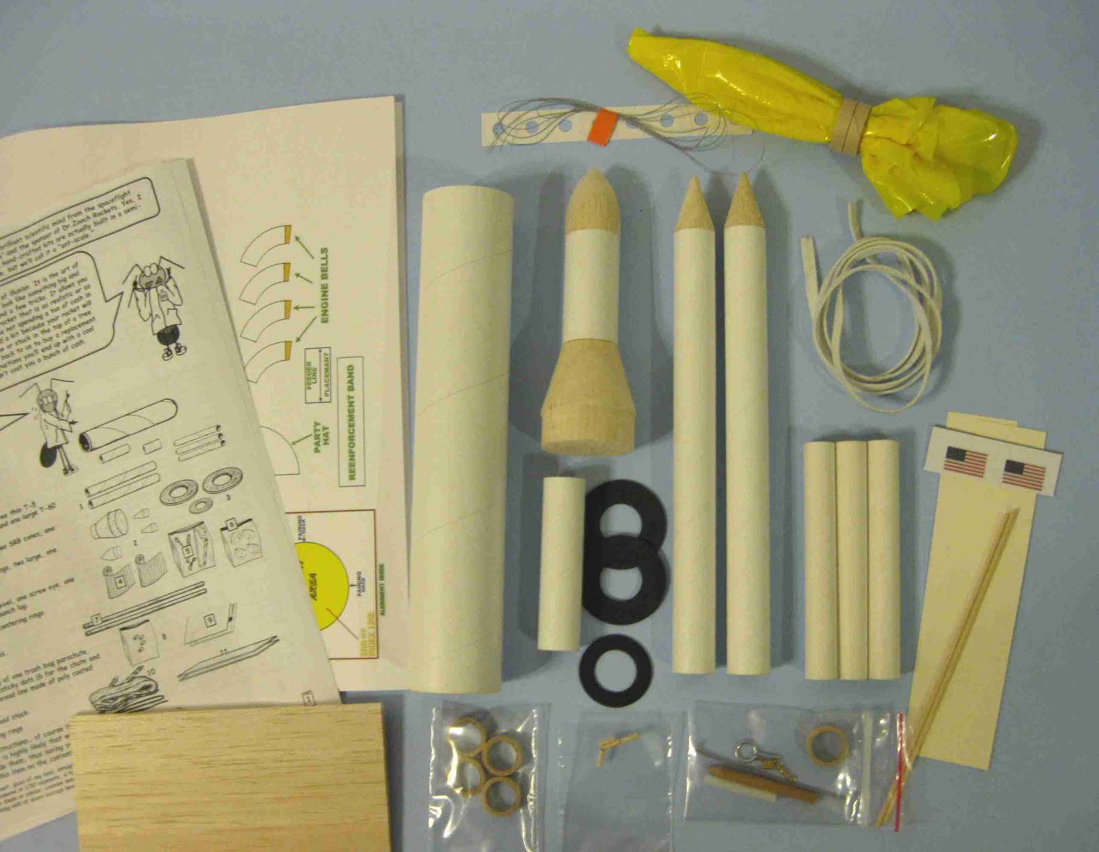 Lots of parts in this one! Three nose cones and one pre weighted balsa adapter, Eight body tubes, the largest is a BT-60 size, An elastic shock cord is included but no Kevlar, Black Letramax ... [Read More]