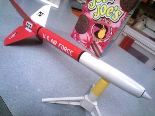 My build is pretty standard, except use of basswood for the fins and a nylon parachute. Painted with Rustoleum 2X Fire Orange & white.