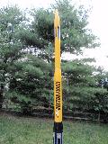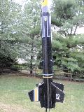 The Vector Force: The Vector Force is a modern Estes kit. This was my first model I made as a BAR. It had very good quality balsa fins on my kit, thick and sturdy. You can see the design is inspired by air defense missiles. It is rather tall, but somewhat heavy because of the two reducers. Because it has two reducer stages it has two separate payload tubes. Estes tells you to glue the payload tubes, but why? Good idea if you want to be sure the rocket doesn't separate in flight, but why waste two very nice payload bays? I just make sure they are always good and tight with some masking tape. Mine is painted school-bus yellow and gloss black to better match the included decals. I added about 3 heavy coats of clear coat for a really deep shine. String stability tests with a C motor required about 20-ish grams of nose weight, but now it flies really straight up - provided there is little wind. The top payload tube has vent holes for a barometric altimeter. I've recorded flights in excess of 400 feet with C6 motors. This is my current go-to flagship rocket. I have tried some test flights with composite D engines, to see if I could kick this puppy past 1000 feet. It sure did! In the process, the shock cord was torn out from the mount. This model was repaired by installing a custom ejection baffle with a Kevlar shock cord attachment. Now I think she'll hold up to a few more D-powered launches and ejections. This rocket has flown higher than the NY Times Building in NY, and also the Chrysler Building including the pinnacle, and the Bank of America Plaza in Atlanta.