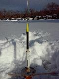 "Finless Rocket #2" - Second prototype design for RAIS (Ram Air Induction Stabilization) testing. Uses an outer compartmentalized shroud and air outlets to try to simulate "air fins" for rear stabilization. BT5 body tube and has streamer recovery.
